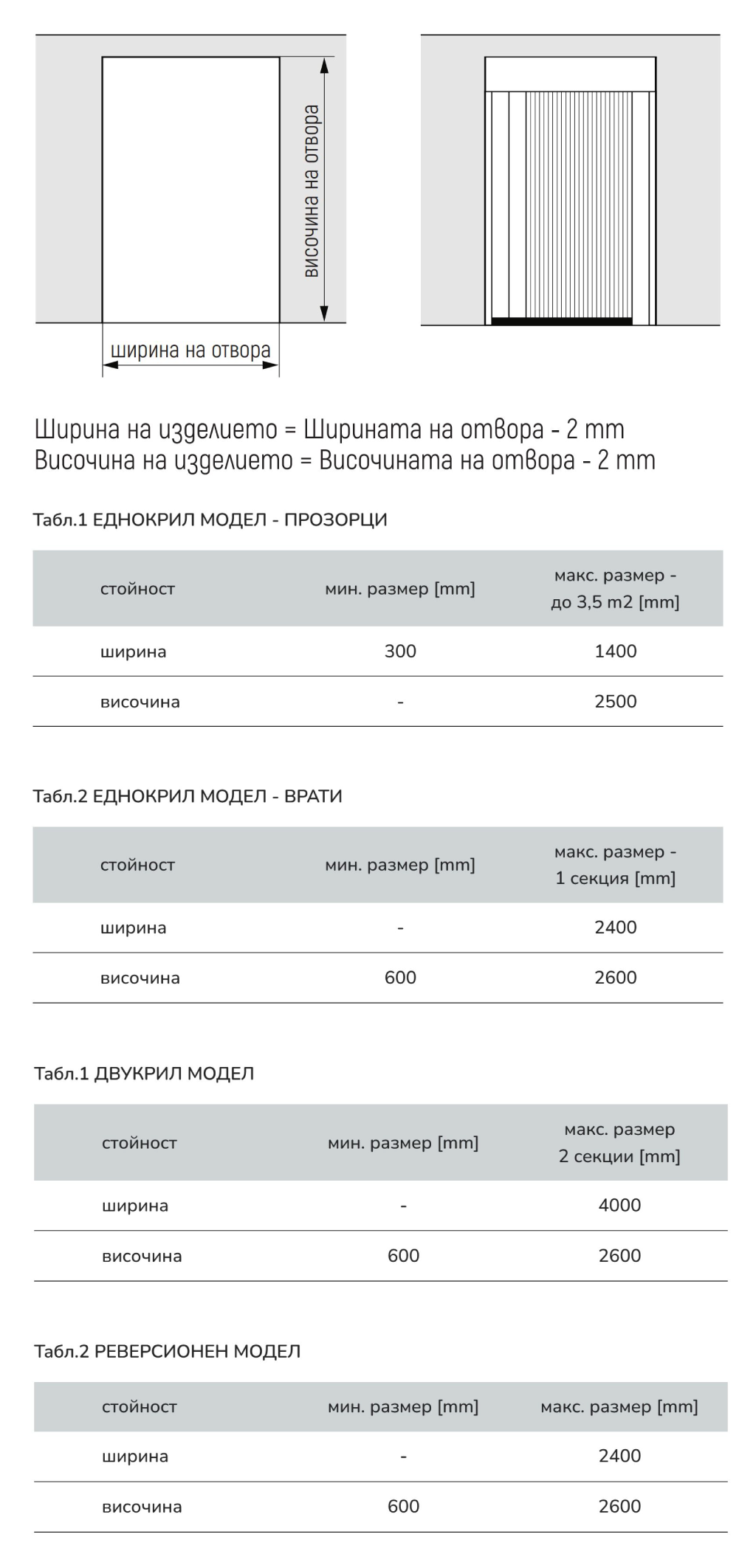 Системата има три модела с отваряне: в една посока [един подвижен корниз, едно платно], с разтваряне в двете посоки [два подвижни корниза, две платна] и с отваряне във всяко направление [два подвижни корниза и едно платно].